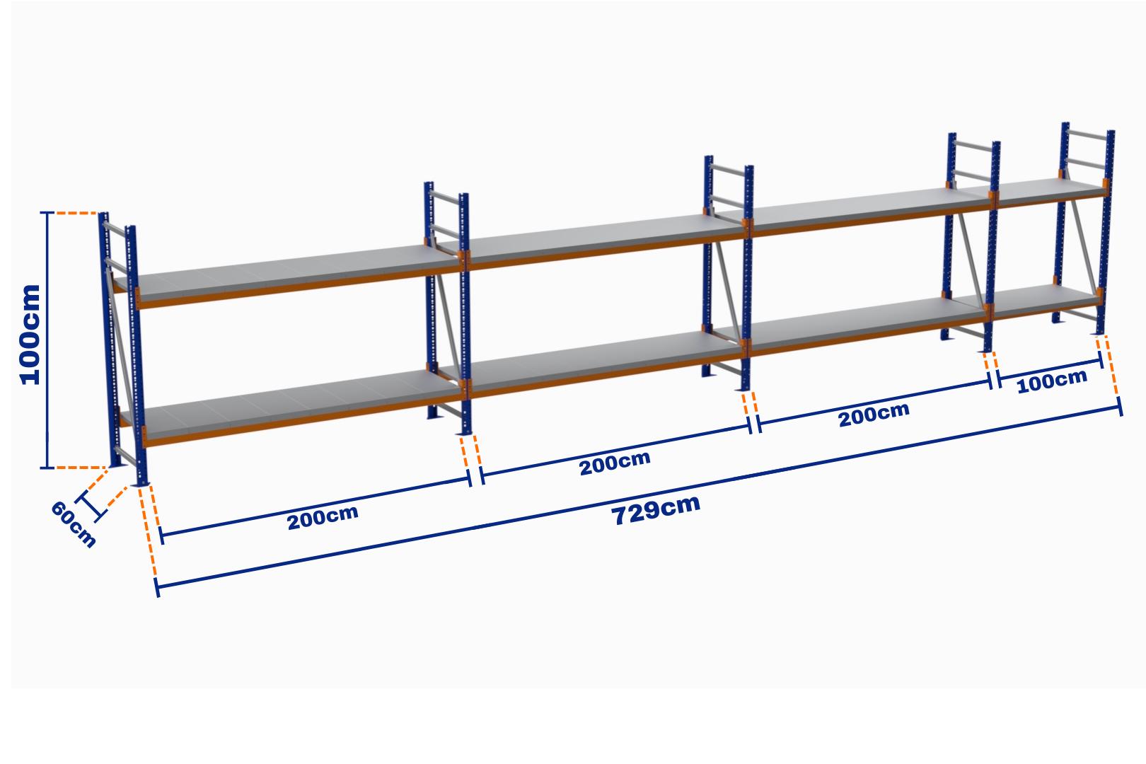 Minirack, Boyalı, 500kg, Yükseklik 1000mm, Genişlik 7290mm, 2 Kat, Kat Arası 700mm, Tavalı, Derinlik 600mm