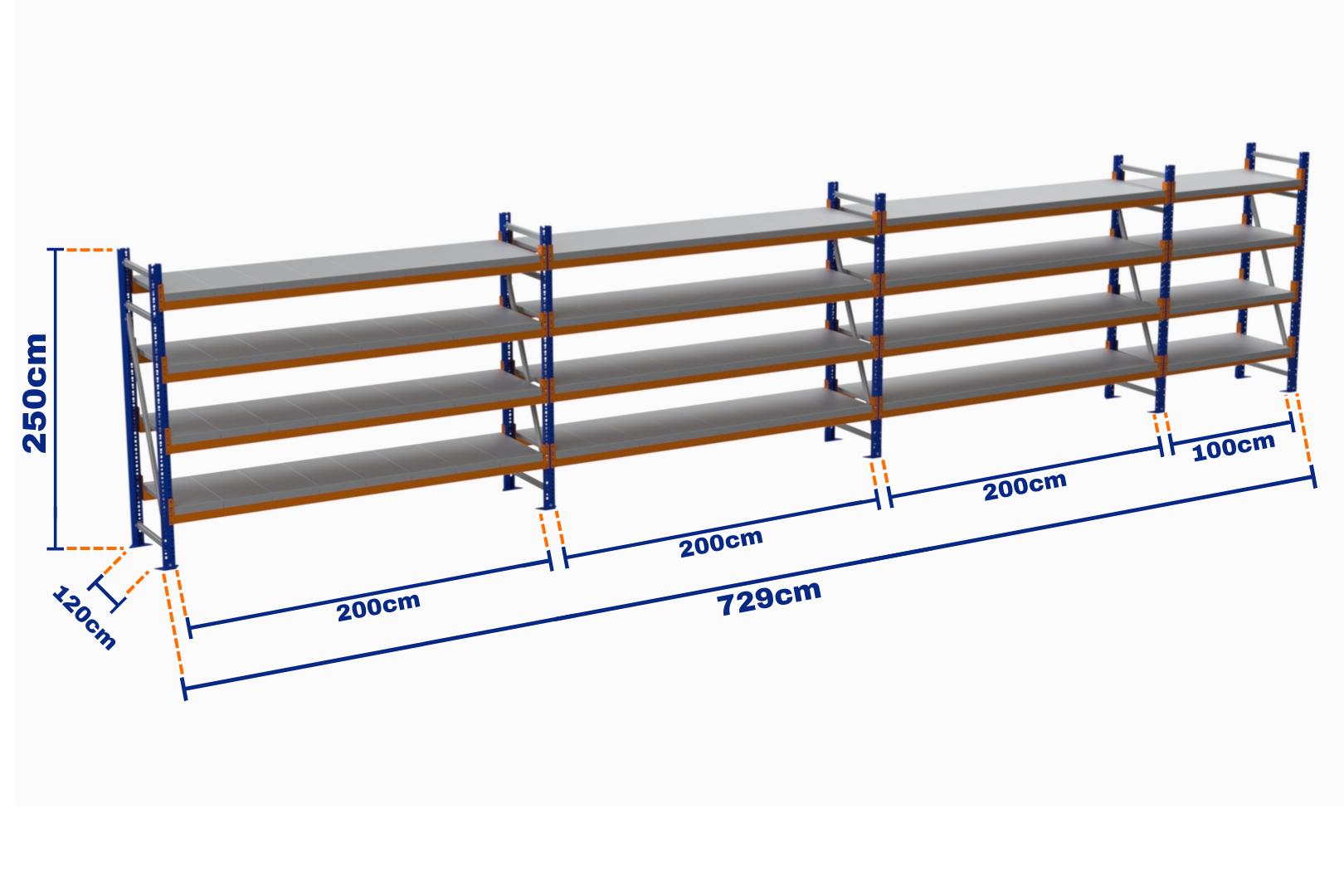 Minirack, Boyalı, 500kg, Yükseklik 2500mm, Genişlik 7290mm, 4 Kat, Kat Arası 700mm, Tavalı, Derinlik 1200mm