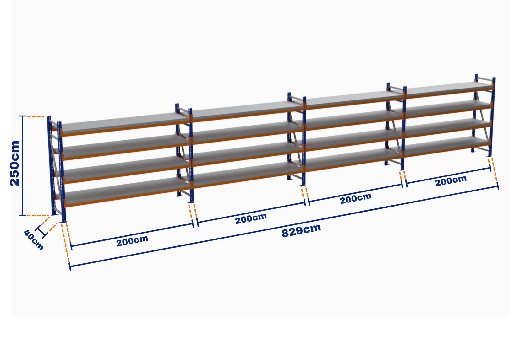 Minirack, Boyalı, 500kg, Yükseklik 2500mm, Genişlik 8290mm, 4 Kat, Kat Arası 700mm, Tavalı, Derinlik 400mm