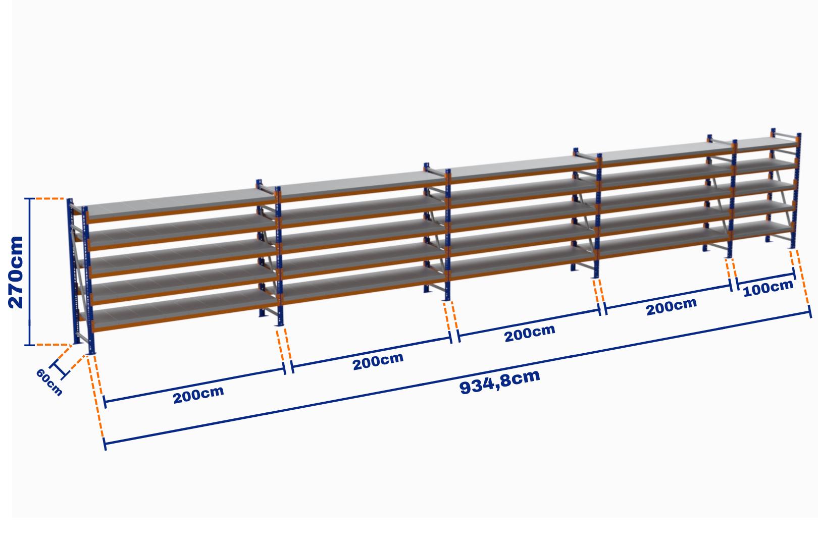 Minirack, Boyalı, 500kg, Yükseklik 2700mm, Genişlik 9348mm, 5 Kat, Kat Arası 595mm, Tavalı, Derinlik 600mm