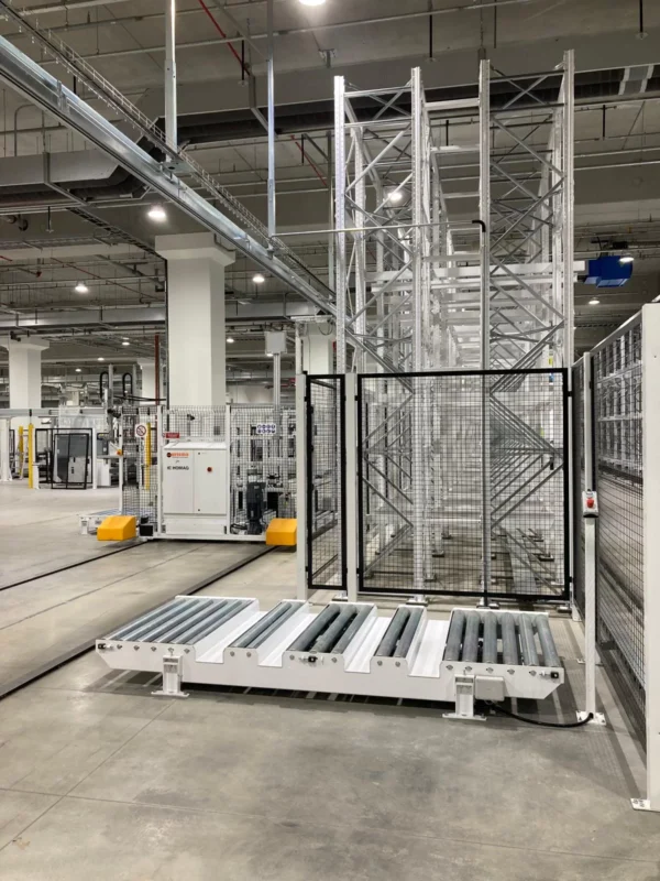 - Kule Robotlar (Stacker Crane): Bir koridor boyunca sabit bir ray üzerinde hem yatay hem de dikey hareket edebilen, içerisinde tüm sistem ve bileşenleri barındıran, PLC kontrolüne sahip robotlardır. 1500 mm genişliğindeki koridorlarda çalışabilirler.